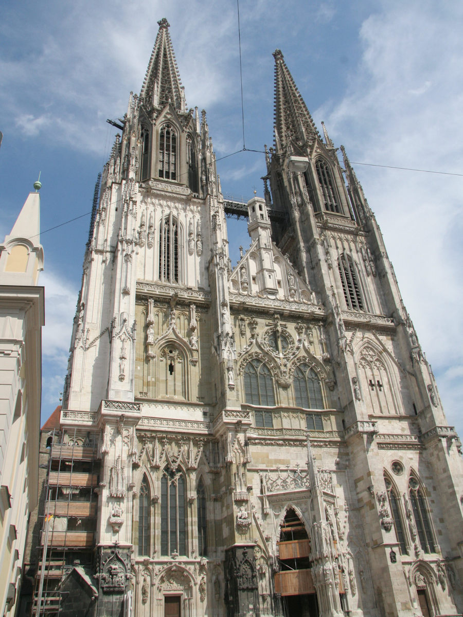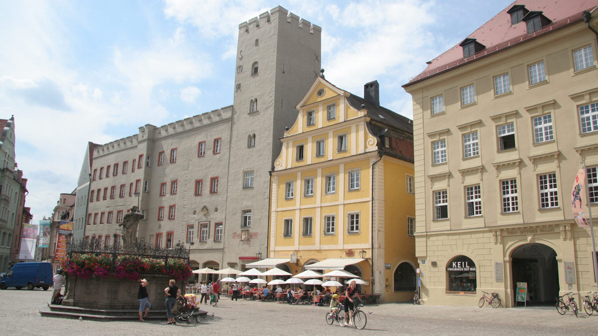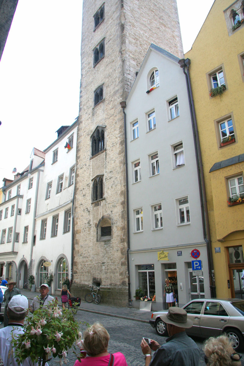 We begin this part with a few "patrician towers." Rich merchants flaunted their wealth and built really tall homes for themselves. Neighbors and competitors tried to outdo them and built even taller buildings. What resulted was a sea of Tall Patrician Towers that stood as status symbols and gave Regensburg a unique skyline. We will see a tower later that even has a clock as fine as on a large church tower!