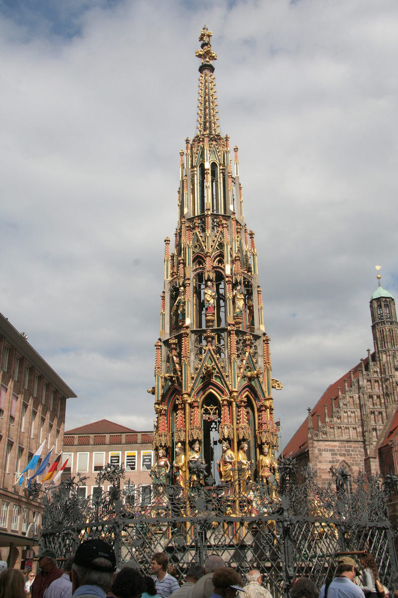 Schoner Brunnen (the Nurnberg Fountain) flanking Frauenkirche |