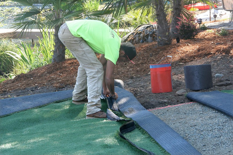 Tom, Alfredo and Sean drag green turf onto Green 2 as Tony's son Nik watches. |