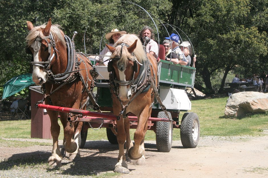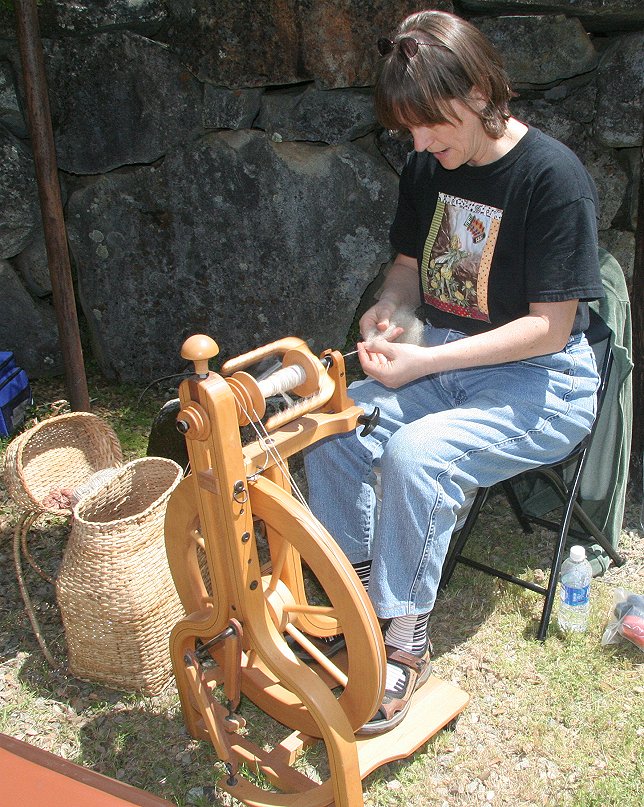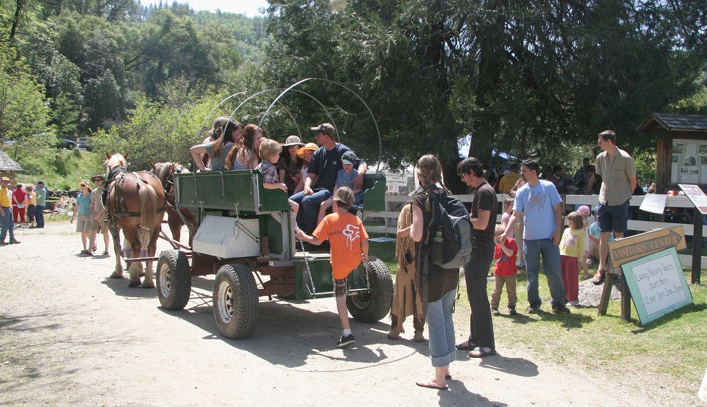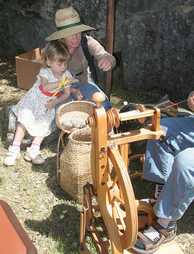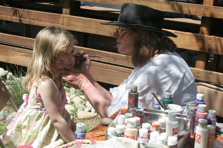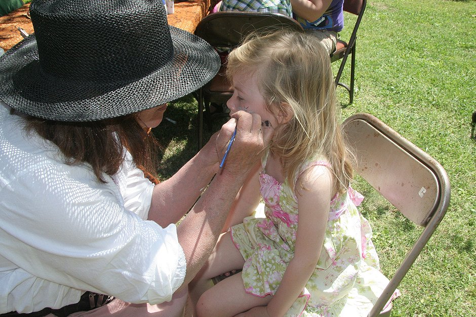 This pictorial story of the event is divided into four pages, simply in the chronological order in which they were taken: Page 1 Bite the Bullet music group, artist's booths, singing artists, Park Volunteers sell raffle tickets, costumed players enjoy hand-dipped ice cream bars. Page 2 Young family in Mountain Man area, volunteers explain Kneebone gas station project, gold panning, paper flower making. Page 3 Yarn spinning, The String Sisters play violin and cello, horse-drawn wagon rides, covered bridge tour, face painting. (this page) Page 4 Face painting, Visitor Center, raffle winner announcements, Dave Taylor barn photograph winner, pottery tent.