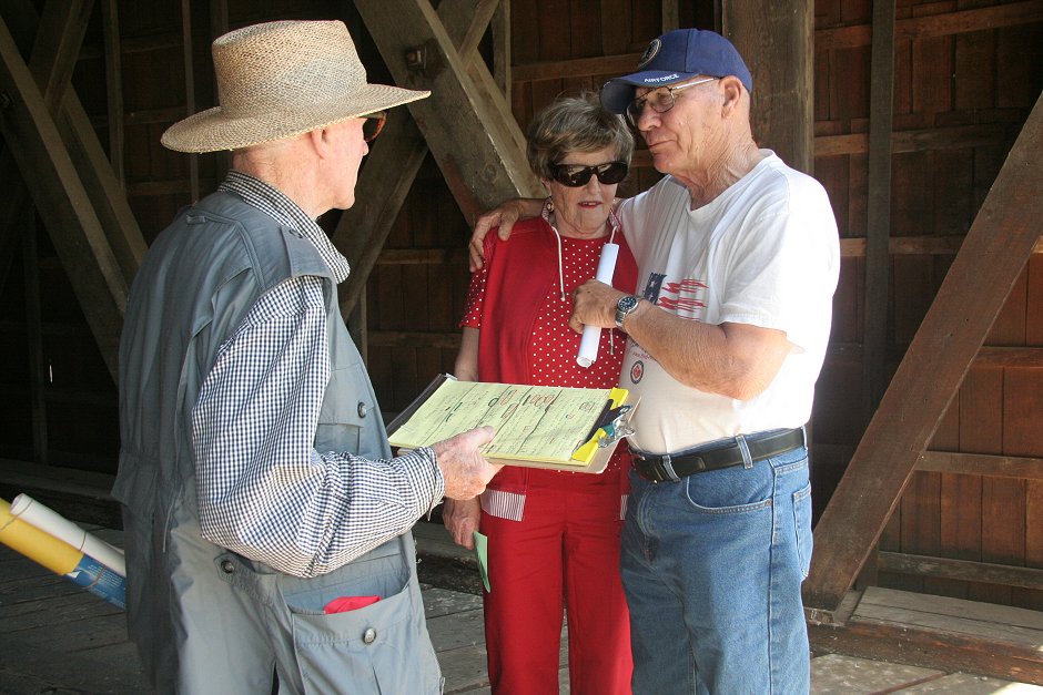 Park Volunteer Don Denton tells some history of the David I. Wood covered bridge. |