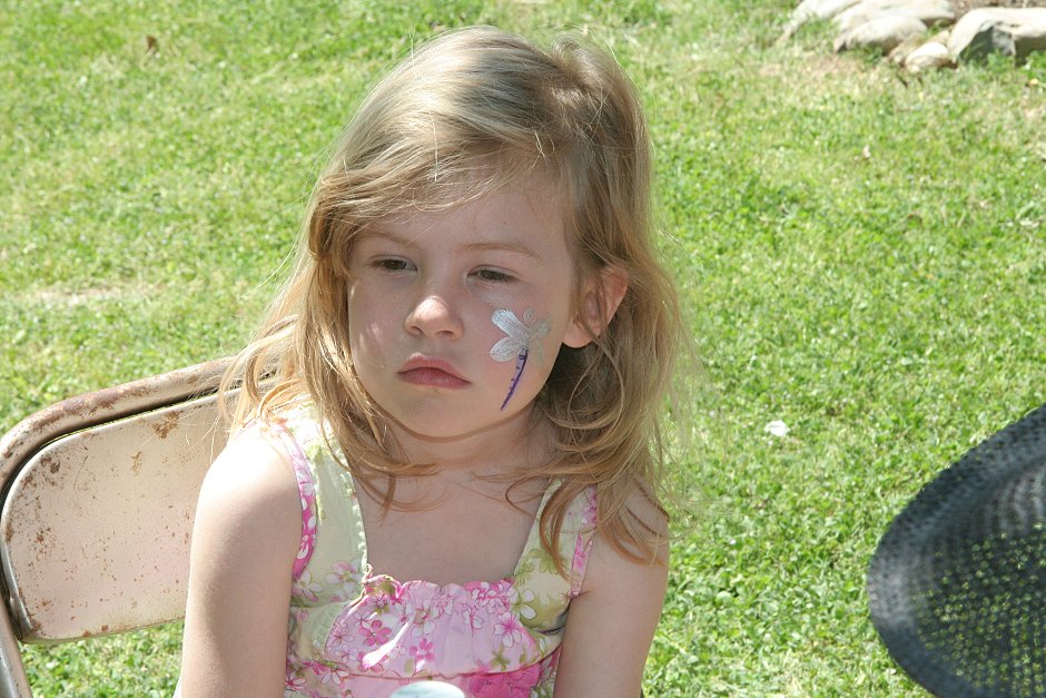 Artist and her many paint brushes and bottles, puts finishing touches on the blonde girl. |