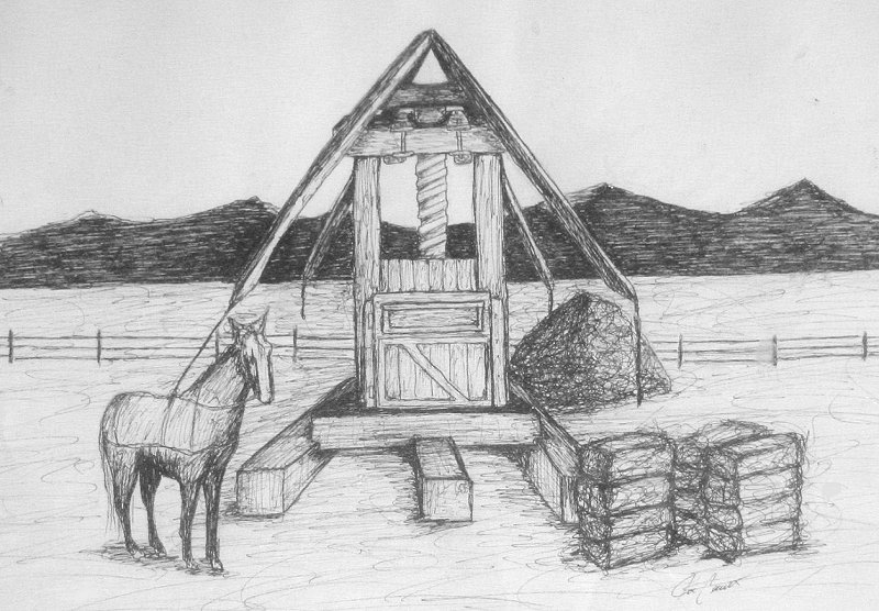 This sketch by Joe Cerutti illustrates operation of the hay press. |