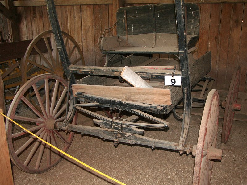 9. Democrat Carriage or Buggy - 1870s onward. A very simple buggy which served as personal transportation. It was not affordable for many families before the 1890s but was popular with professional people for quick trips between towns. Small loads or luggage could be carried in the bed. Because it has no top or cover, in cold weather the driver and passengers used heavy lap robes and sometimes a metal foot warmer, filled with fire coals. This wagon belonged to Joseph Wood, a teamster from the nearby town of Oregon House, and was donated to California State Parks by his daughter upon his death in 1965.