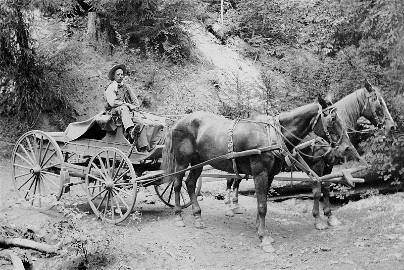 10. Stage or Concord Mountain Wagon - date uncertain, popular 1850’s - 1880’s. Used as a stagecoach on the Bidwell to Burney run. Note the multi-layered leather straps strung from front to rear under the bed, which served as springs, called thoroughbraces. They were designed to ease the strain on the horses, not passengers, by easing carriage motion during starts and stops. Like modern SUVs, a second seat could be added or removed as needed. |